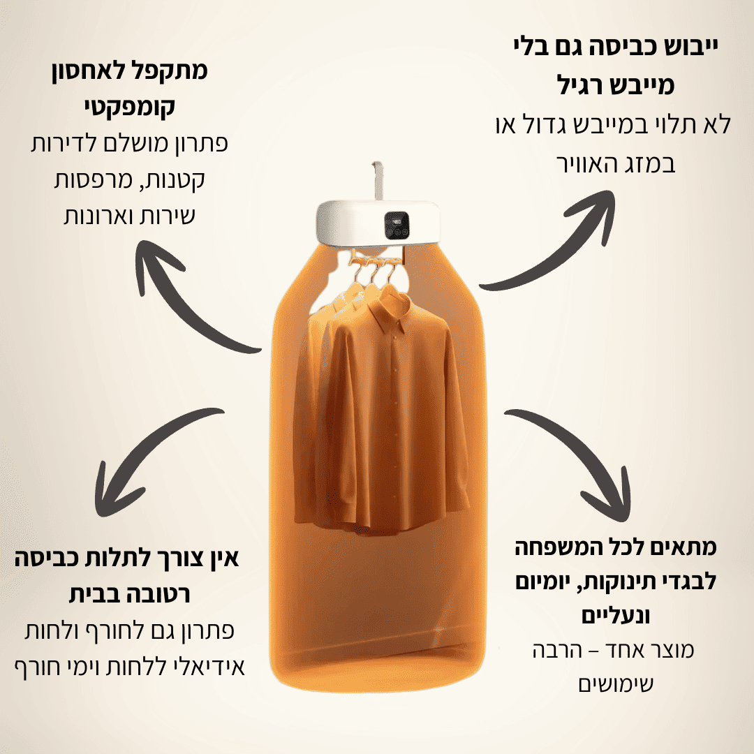 אין צורך בהתקנות מורכבות או בצינורות פליטה. פשוט תולים על כל וו או מוט, מחברים לחשמל ונהנים מייבוש מהיר ושקט בכל מקום שתרצו.